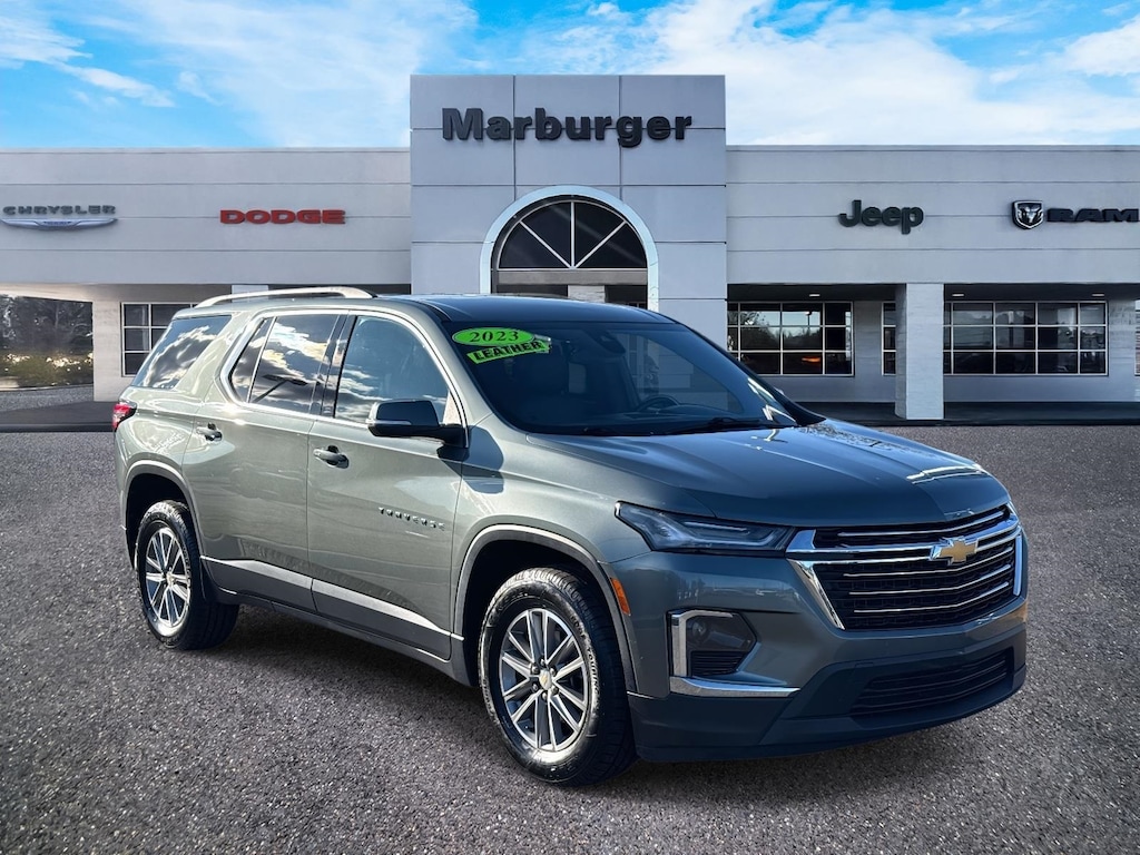 2023 Chevrolet Traverse LT Leather Floor Liner Package (LPO) (1st & 2nd Row All-Weather Floor Liner (LPO), 3rd Row All-Weather Floor Liner (LPO), and Integrated Cargo Liner (LPO)), Preferred Equipment Group 3LT (Heated Driver & Front Passenger Seats), 3.49 Axle Ratio, 3rd row seats: split-bench, 4-Wheel Disc Brakes, 6 Speakers, 6-Speaker Audio System Feature, 6-Way Power Front Passenger Seat, 8-Way Power Driver Seat Adjuster, ABS brakes, Air Conditioning, Alloy wheels, AM/FM radio: SiriusXM with 360L, Apple CarPlay/Android Auto, Auto High-beam Headlights, Automatic temperature control, Black Roof Rails, Brake assist, Bumpers: body-color, Compass, Delay-off headlights, Driver door bin, Driver vanity mirror, Dual front impact airbags, Dual front side impact airbags, Electronic Stability Control, Emergency communication system, Exterior Parking Camera Rear, Four wheel independent suspension, Front anti-roll bar, Front Bucket Seats, Front Center Armrest, Front dual zone A/C, Front Passenger 2-Way Power Lumbar, Front reading lights, Fully automatic headlights, Garage door transmitter, Heated door mirrors, Heated front seats, Heated steering wheel, Illuminated entry, Leather steering wheel, Leather-Appointed Seat Trim, Low tire pressure warning, Not Equipped w/Rear Park Assist (060), Occupant sensing airbag, Outside temperature display, Overhead airbag, Overhead console, Panic alarm, Passenger door bin, Passenger vanity mirror, Power door mirrors, Power Driver Lumbar Control, Power driver seat, Power Liftgate, Power passenger seat, Power steering, Power windows, Premium audio system: Chevrolet Infotainment 3 Plus, Radio data system, Radio: Chevrolet Infotainment 3 Plus System, Rear air conditioning, Rear anti-roll bar, Rear reading lights, Rear window defroster, Rear window wiper, Remote keyless entry, Security system, SiriusXM w/360L, Speed control, Speed-sensing steering, Spoiler, Steering wheel mounted audio controls, Tachometer, Telescoping steering wheel, Tilt steering wheel, Traction control, Trip computer, Turn signal indicator mirrors, Variably intermittent wipers, Voltmeter, and Wheels: 18" Bright Silver-Painted Aluminum.