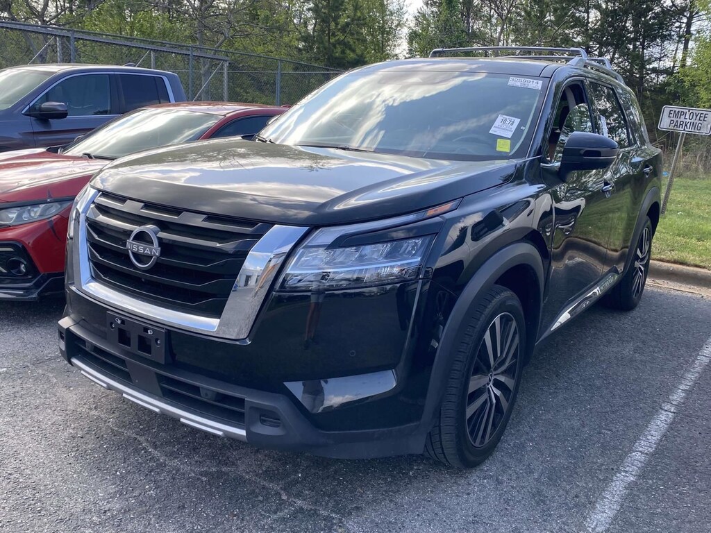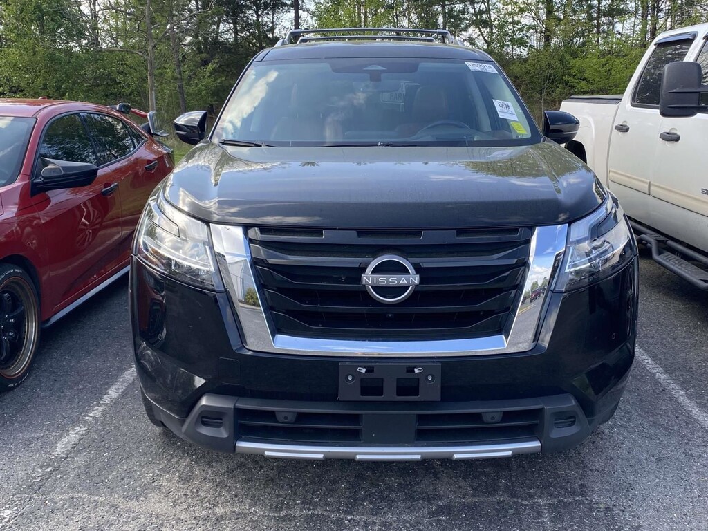 2023 Nissan Pathfinder Platinum Cargo Package (Cargo Area Protector, Cargo Net, and First Aid Kit), 4WD, 13 Speakers, 4-Wheel Disc Brakes, ABS brakes, Bose Premium Audio System, Dual front impact airbags, Dual front side impact airbags, Heads-Up Display, Memory seat, Navigation system: NissanConnect Navigation, NissanConnect w/Navigation & Services, Power driver seat, Power steering, Power windows, Radio: AM/FM Audio System, Remote keyless entry, Steering wheel memory, 3rd row seats: bench, Air Conditioning, Alloy wheels, AM/FM radio: SiriusXM, Auto High-beam Headlights, Auto tilt-away steering wheel, Auto-dimming Rear-View mirror, Automatic temperature control, Axle Ratio: 4.334, Bench Seat Carpeted Floor Mats (Set of 4), Bodyside moldings, Brake assist, Bumpers: body-color, Cross Bars, Delay-off headlights, Driver door bin, Driver vanity mirror, Electronic Stability Control, Emergency communication system: NissanConnect Services, Exterior Parking Camera Rear, Four wheel independent suspension, Front anti-roll bar, Front Bucket Seats, Front Center Armrest, Front dual zone A/C, Front reading lights, Fully automatic headlights, Garage door transmitter: HomeLink, Heated & Cooled Front Bucket Seats, Heated door mirrors, Heated front seats, Heated rear seats, Heated steering wheel, Illuminated entry, Knee airbag, Leather steering wheel, Low tire pressure warning, Occupant sensing airbag, Outside temperature display, Overhead airbag, Overhead console, Panic alarm, Passenger door bin, Passenger vanity mirror, Power door mirrors, Power Liftgate, Power moonroof, Power passenger seat, Radio data system, Rain sensing wipers, Rear air conditioning, Rear anti-roll bar, Rear reading lights, Rear seat center armrest, Rear side impact airbag, Rear window defroster, Rear window wiper, Reclining 3rd row seat, Security system, Semi-Aniline Leather Seating Surfaces, Speed control, Speed-sensing steering, Speed-Sensitive Wipers, Split folding rear seat, Spoiler, Steering wheel mounted audio controls, Tachometer, Telescoping steering wheel, Tilt steering wheel, Traction control, Trip computer, Turn signal indicator mirrors, Variably intermittent wipers, Ventilated front seats, and Wheels: 20" Machined Alloy w/Dark Met Gray Finish.