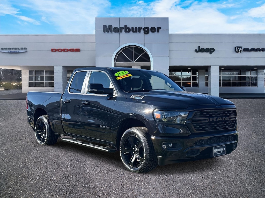 2024 Ram 1500 Big Horn/Lone Star Big Horn Level B Equipment Group (115V Auxiliary Power Outlet, 400W Inverter, 4G LTE Wi-Fi Hot Spot, 9 Amplified Speakers w/Subwoofer, Air Conditioning ATC w/Dual Zone Control, All R1 High Radios, All Radio Equipped Vehicles, Apple CarPlay, Auto-Dimming Exterior Driver Mirror, Auto-Dimming Rear-View Mirror, Black Premium Power Mirrors, Class IV Receiver Hitch, Cluster 7.0" TFT Color Display, Connected Travel & Traffic Services, Connectivity - US/Canada, Convex Wide-Angle Mirror Insert, Electric Shift-On-Demand Transfer Case, Exterior Mirrors Courtesy Lamps, Exterior Mirrors w/Heating Element, Exterior Mirrors w/Supplemental Signals, For Details, Visit DriveUconnect.com, For More Info, Call 800-643-2112, Front Fog Lamps, Global Telematics Box Module (TBM), Glove Box Lamp, Google Android Auto, GPS Navigation, HD Radio, Heated Front Seats, Heated Steering Wheel, Integrated Voice Command w/Bluetooth, LED Footwell Lighting, Media Hub w/2 Charge Only USBs, ParkSense Front/Rear Park Assist w/Stop, Power 2-Way Driver Lumbar Adjust, Power 8-Way Driver Seat, Power Adjustable Pedals, Power-Folding Mirrors, Radio: Uconnect 5 Nav w/12.0" Display, Rear Dome w/On/Off Switch Lamp, Rear Power Sliding Window, Rear Window Defroster, Remote Start System, Security Alarm, SiriusXM Radio Service, SiriusXM w/360L, Sun Visors w/Illuminated Vanity Mirrors, Universal Garage Door Opener, and USB Host Flip), Night Edition (3 Rear Seat Head Restraints, 4 Way Front Headrests, Accent Color Door Handles, Accent Color Premium Power Mirrors, Anti-Spin Differential Rear Axle, Black Exterior Truck Badging, Black Headlamp Bezels, Black Interior Accents, Black Painted Exterior Mirrors Caps, Body Color Front Bumper, Body Color Rear Bumper w/Step Pads, Bucket Seats, Deluxe Cloth Bucket Seats, Dual Exhaust w/Black Tips, Front Seat Back Map Pockets, Full Length Floor Console, Grille Surround 1 Black Texture 2 Black, Manual Adjust 4-Way Front Passenger Seat, RAM Grille Badge - Black, Rear 60/40 Folding Seat, and Wheels: 20" x 9.0" Premium Paint/Polished), Quick Order Package 27Z Big Horn, 3.21 Rear Axle Ratio, 4-Wheel Disc Brakes, 48V Belt Starter Generator, 6 Speakers, ABS brakes, Air Conditioning, Alloy wheels, AM/FM radio, Blind Spot & Cross Path Detection, Brake assist, Bumpers: chrome, Cloth Bench Seat, Compass, Delay-off headlights, Driver door bin, Dual front impact airbags, Dual front side impact airbags, Electronic Stability Control, Emergency communication system: RAM Connect, Front anti-roll bar, Front Center Armrest w/Storage, Front License Plate Bracket, Front reading lights, Front wheel independent suspension, Fully automatic headlights, Heated door mirrors, Illuminated entry, Leather steering wheel, LED Taillamps, Low tire pressure warning, MOPAR Front & Rear Rubber Floor Mats, Occupant sensing airbag, Outside temperature display, Overhead airbag, Overhead console, Panic alarm, ParkView Rear Back-Up Camera, Passenger door bin, Passenger vanity mirror, Power door mirrors, Power steering, Power windows, Radio data system, Radio: Uconnect 3 w/5" Display, Rear anti-roll bar, Rear seat center armrest, Rear step bumper, Remote keyless entry, Speed control, Split folding rear seat, Steering wheel mounted audio controls, Tachometer, Telescoping steering wheel, Tilt steering wheel, Traction control, Trailer Brake Control, Trip computer, Variably intermittent wipers, Voltmeter, and Wheels: 18" x 8" Cast-Aluminum PainteD.